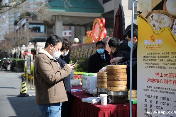 一顶帐篷、一排货架,一张桌子、一块招牌,在中山东路307号的江苏省会议南门临时售卖点,包子、点心、卤菜整齐码放台前。钟山大肉包5元/个、盐水鸭58元/半只、红烧小龙虾128元/1.5斤。实惠的价格不断吸引过往市民驻足购买,一位住在对面小区的奶奶推着自行车和老伴专程前来选购肉包和烧卖,“大宾馆口味肯定好,现在做外卖了,当然要来尝尝!”。